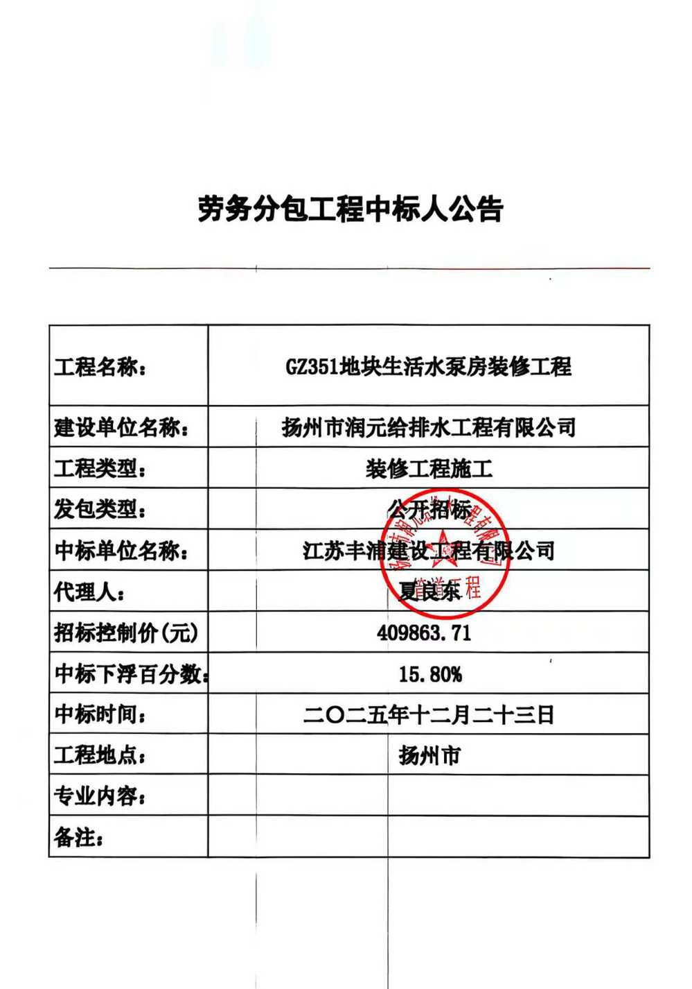 GZ351地块生活水泵房装修工程劳务分包工程中标人公告